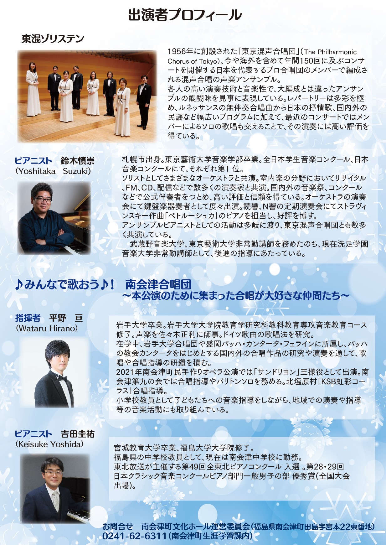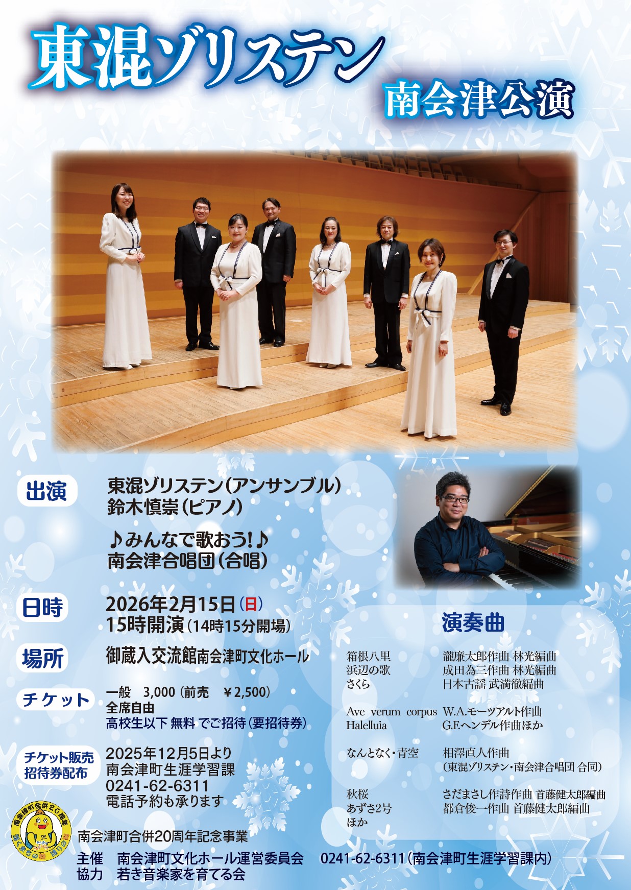 公演限定の特設南会津合唱団との共演もあり、親しみのある日本の歌も演奏されますので、お気軽にお越しください。