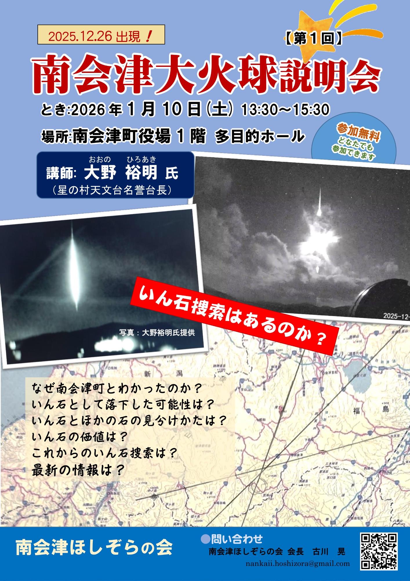 南会津ほしぞらの会では、早々に「南会津大火球説明会」を開催します。